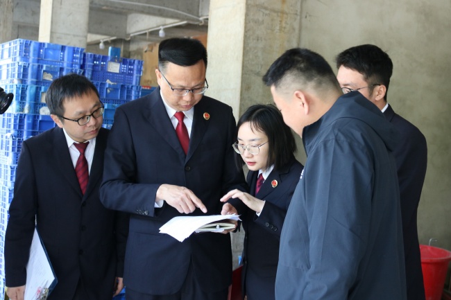 2025年3月,肖喜伟(左二)和同事在某社区团购网格仓对一起涉食品安全公益诉讼案件线索进行调查。